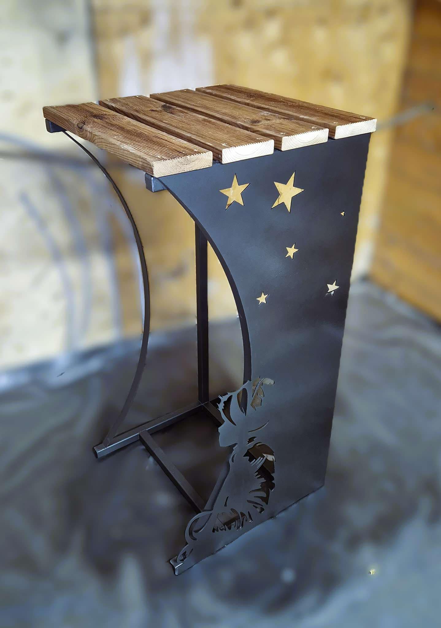 Metallinen ja puinen puunjalusta